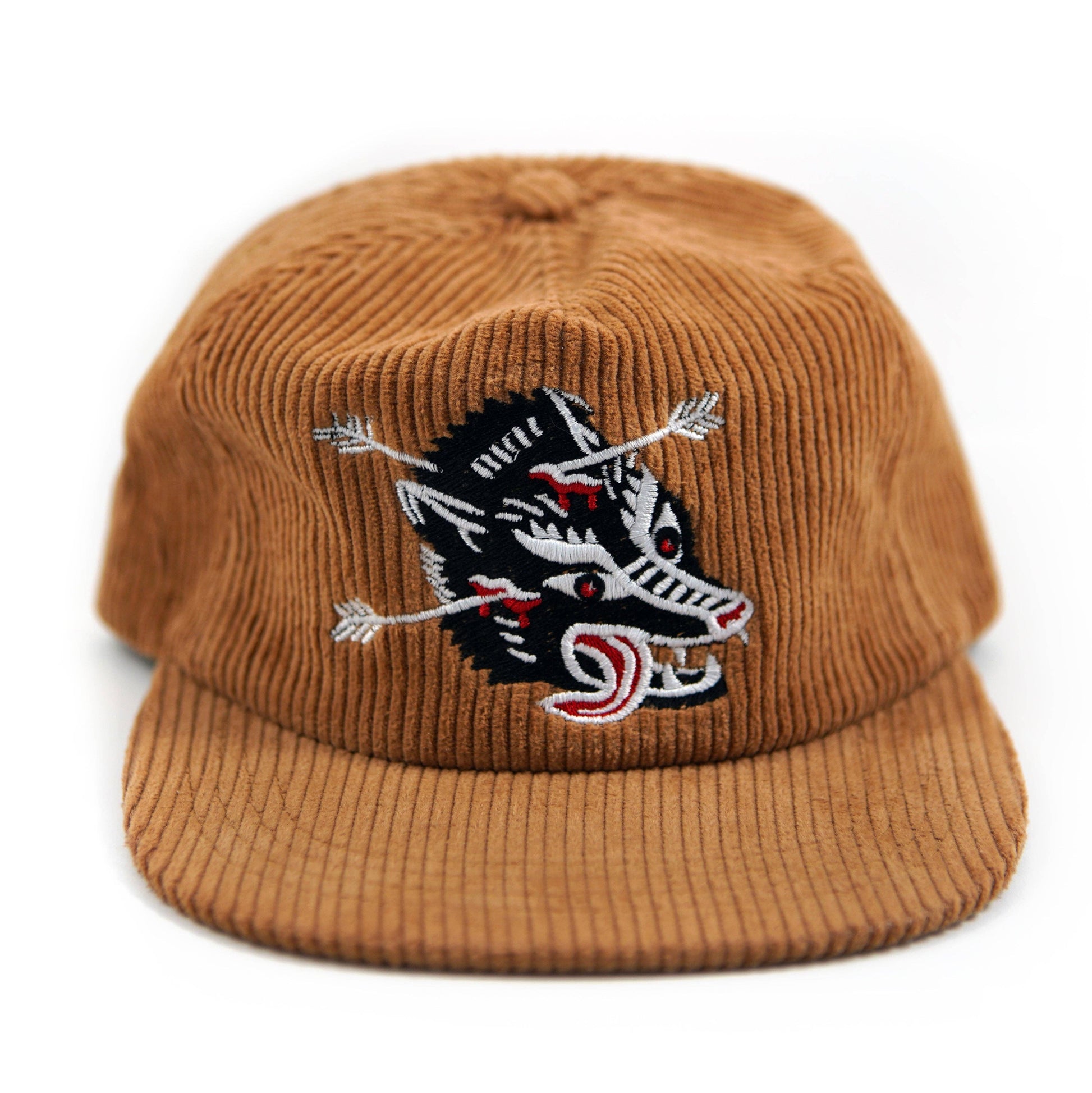An unstructured baseball-style adjustable cap made of workwear brown corduroy with black, white and red embroidery of a wolf with arrows.
